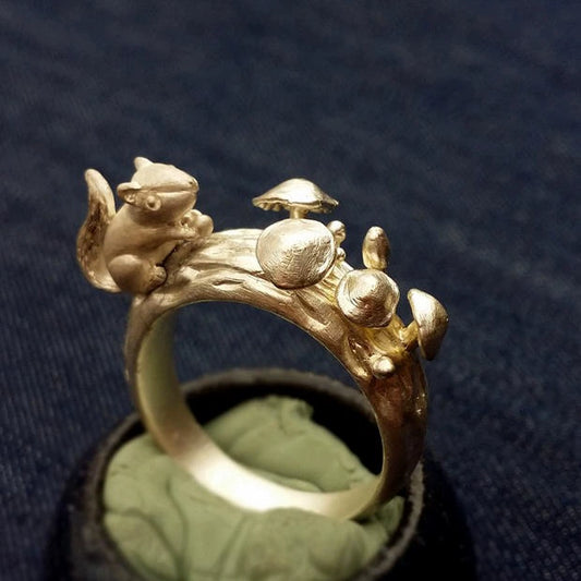 Squirrel Mushroom Gathering Ring - Hand-Carved 925 Silver Jewelry