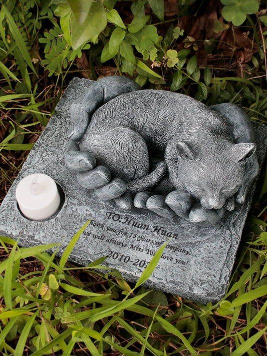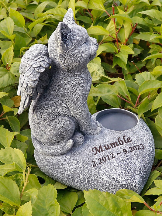 Angel Cat Memorial Stone - Pet Grave Marker with Candle